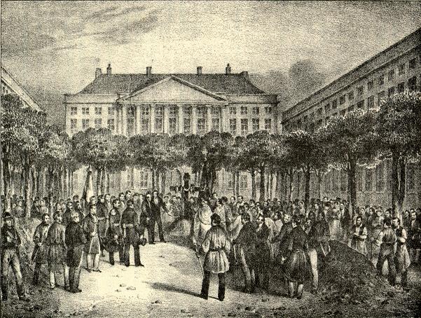 Shortly after the events of September 1830, the revolutionaries didn’t know what to do with the more then 450 dead and they decided to bury some of them on the square. The Provisory Government, appointed immediately after the Independence, decided in 1831 to create a national burial ground for the fallen of the Revolution. A special crypt was created underneath the square and in 1838 a monument in honour of the heroes was unveiled and the square acquired its final name of Place des Martyrs.
